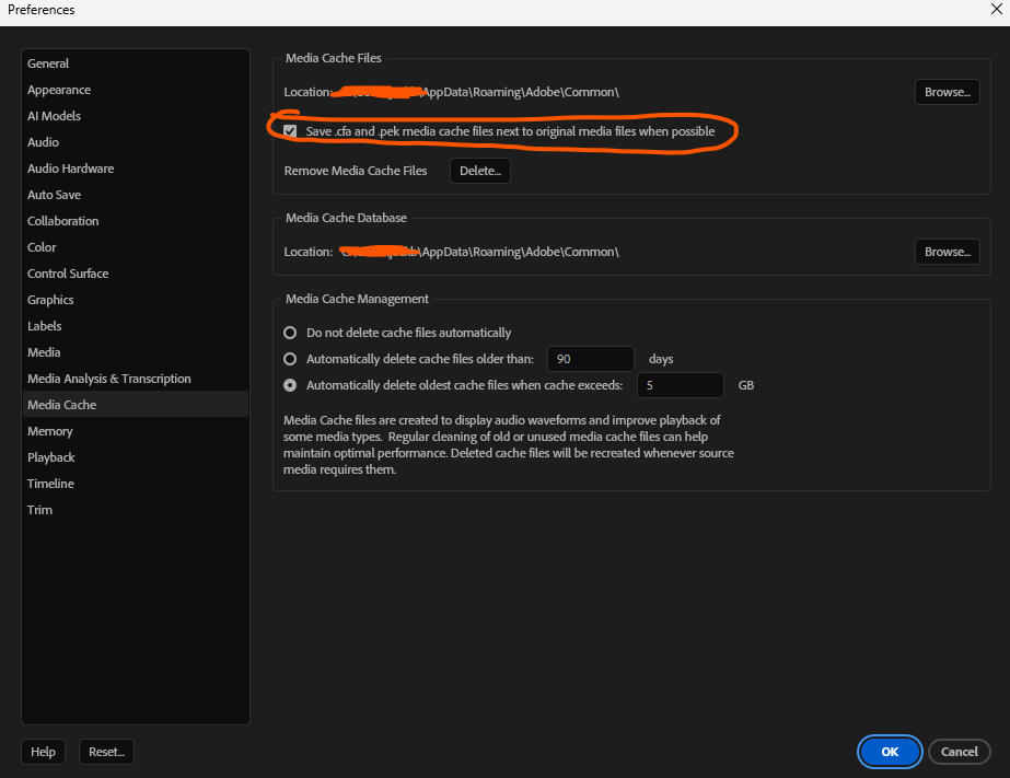 It is best practice to save temporary files next to the media for more efficient editing. Sometimes, Premiere Pro does not effectively clean these files.